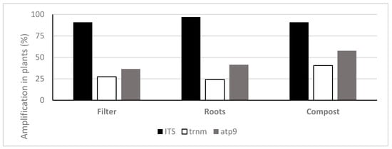 Real-time PCR was used to detect and quantify the oomycete load in environmental DNA (eDNA) extractions from filters, roots and composts. TaqMan assays were performed using three different loci (Table 1): Internal Transcribed Spacer (ITS) region (All_Phy_probe and FITS_15Ph, RITS_279Ph primers designed by Kox et al. []; trnM-trnP-trnM region (using TrnM_PhyG_probe2 and primers PhyG-F2, PhyG-Rb) and atp9-nad9 region (ATP9_PhyG2_probeR and primers PhyG_ATP9_2FTail, PhyG_R6_Tail) [].