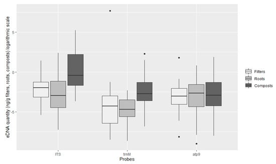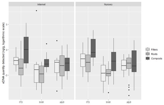 Quantification of oomycete eDNA (ng g−1, logarithmic scale) by TaqMan probe on filters, roots and plant composts. Boxplots indicate the 25th percentile (Q1, lower boundary), median (black line) and 75th percentile (Q3, upper boundary). Upper and lower whiskers indicate 10th and 90th percentiles. Dots above and below the whiskers represent outliers.