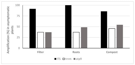 High numbers of oomycete infections were also found in asymptomatic ornamental plants by Migliorini et al. [] using real-time PCR. Approximately 70% of asymptomatic plants were contaminated by one or more species of Phytophthora, Pythium and Phytopythium. In the work described here, however, the ITS probe detected oomycetes in the roots of all asymptomatic plants, along with 91.43% of filters and 85.71% of composts. Asymptomatic plants such as P9 (Hebe x franciscana ‘Variegata’) included large quantities of oomycete DNA in the composts (14.19 ng g−1 of DNA using the general oomycete ITS probe), or P77 (Pinus mugo) compost, containing 3.43 ng g−1 and 5.74 ng g−1 of Phytophthora DNA detected with trnM and atp9 probes, respectively. These results confirmed the high rates of oomycete species present in ornamental plants reported by Migliorini et al. []. Other studies carried out by Prigigallo et al. [,] demonstrated the wide diversity of Phytophthora species present in ornamental plants using molecular methods (semi-nested PCR and metabarcoding), including some putative novel species.