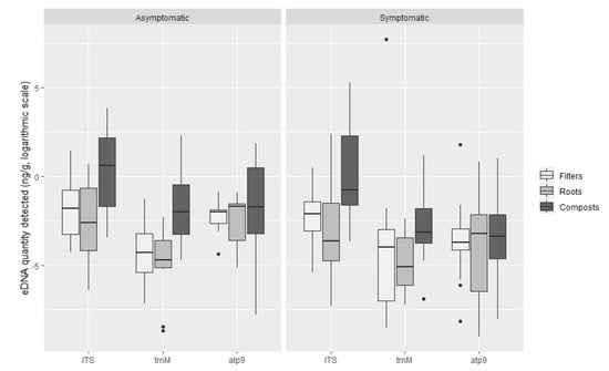 Quantification of oomycete eDNA (ng g−1, logarithmic scale) in symptomatic and asymptomatic plants by TaqMan probe. Boxplots indicate the 25th percentile (Q1, lower boundary), median (black line) and 75th percentile (Q3, upper boundary). Upper and lower whiskers indicate 10th and 90th percentiles. Dots above and below the whiskers represent outliers.