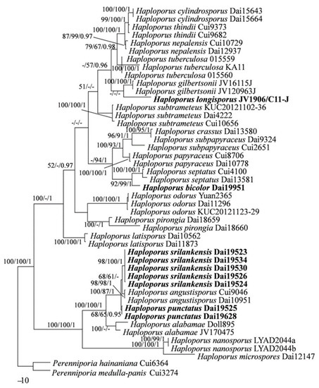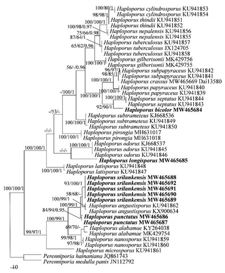 In both ITS + nLSU + mtSSU- and ITS-based phylogenies (Figure 1 and Figure 2), four new well-supported lineages were identified. Among them are two well-supported terminal clades and two isolated branches. Four specimens from Sri Lanka formed a well-supported clade (98% MP 100% ML and 1.00 BI), named as Haploporus srilankensis, sister to H. angustisporus. And two specimens of Haploporus punctatus nested in the same clade as H. srilankensis and H. angustisporus. In addition, samples of Haploporus bicolor and H. longisporus formed two distinct lineages, H. bicolor is sister to H. septatus L.L. Shen, Y.C. Dai and B.K. Cui; but H. longisporus is an independent lineage.