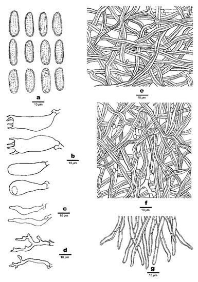 Microscopic structures of Haploporus longisporus (Holotype). (a). Basidiospores. (b). Basidia and basidioles. (c). Cystidioles. (d). Dendrohyphidia. (e). Hyphae from subiculum. (f). Hyphae from trama. (g). Hyphae at dissepiment edge.