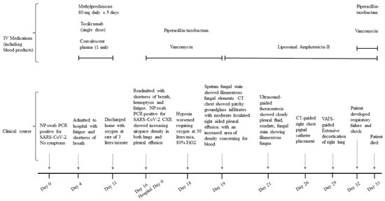 Clinical course of a patient with COVID-19 who developed pulmonary mucormycosis.