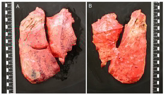 (A,B) Macroscopy of the right and left lung. All lobes showed white/yellow consolidations. In the left upper lobe, an abscess with a diameter of 2 cm and in the right upper lobe an abscess of 6.5 cm were found, both filled with green/yellow pus. Cultures of these lesions showed growth of Aspergillus fumigatus.