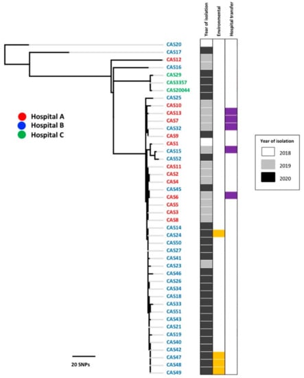 Whole genome sequence data using core genome SNPs indicated that all isolates belonged to the South Asian lineage (Figure S1). The high-resolution SNP tree revealed a small level of genetic heterogeneity among the isolates (Figure 1). Thirty-seven isolates from two tertiary care hospitals (A and B) including both human and environmental samples in various medical wards and ICUs collected from 2018 to 2020 clustered in one major clade, which could be the predominant “circulating clone”, while three isolates (CAS29, CAS20044, and CAS3357) from one patient in Hospital C clustered separately. Four other isolates (CAS20, CAS12, CAS16, CAS17) from Hospitals A and B also diverged from the major clade. CAS20 represented the first reported case in Qatar: the patient had received healthcare in Oman, and the sequence was divergent from the outbreak samples in Hospitals A and B. The remaining three divergent isolates (CAS12, 16, and 17) were from patients without recent travel histories, while CAS12 was from a patient who was transferred from a long-term care unit within the state of Qatar, indicating that the hospital/community may harbor additional circulating C. auris strain from the South Asian lineage, apart from the predominant outbreak clone.