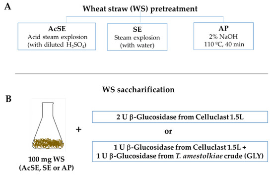 The efficiency of T. amestolkiae enzyme cocktails as β-glucosidase supplements for saccharification was studied. For this, wheat straw subjected to three different pretreatments was used (Figure 1A): (i) acidic wheat straw (abbreviated as AcSE), obtained by steam explosion in the presence of dilute sulfuric acid (kindly provided by Abengoa Bioenergía, Babilafuente, Salamanca); (ii) neutral wheat straw (abbreviated as SE), obtained by steam explosion in the presence of water, also provided by Abengoa Bioenergía; (iii) and alkaline wheat straw (abbreviated as AP), prepared as follows: 5 g of wheat straw was incubated with 100 mL of 2% NaOH for 40 min and 110 °C using an autoclave, the solid material was then washed three times with water, the pH was adjusted to 5 with sulfuric acid, lyophilized, and stored. The composition of AP wheat straw was analyzed by sequential fractionation. In this process, the contents of cellulose, hemicellulose, and Klason lignin were determined through a quantitative acid hydrolysis [17]. In brief, the solid residue (300 mg) was treated for 1 h with 3 mL of 13.5 M sulfuric acid (H2SO4) at 30 °C and 150 rpm. Then, H2SO4 was diluted to 0.5 M and heated at 110 °C for 1 h. Sugars in the liquid fraction were identified and quantified by gas chromatography [18]. The slurry remaining after acid hydrolysis (Klason lignin) was washed until neutrality, oven dried at 55 °C, and weighted. All analyses were carried out in triplicate.