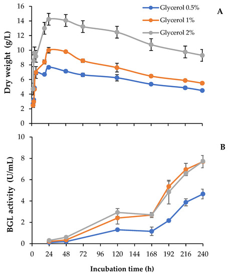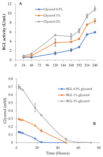 Thus, to investigate the effect of pH on BGL production, we repeated the experiment buffering all media with phosphate pH 6 to maintain the pH as constant across the incubation period. In these conditions, BGL activity and fungal growth went in parallel, and the highest values for both were detected in cultures with 2% glycerol (Figure 3A). It should also be noticed that the total amount of secreted proteins detected in 2% glycerol unbuffered cultures was considerably lower than in the buffered ones (0.10 and 0.17 mg/mL, respectively). These results suggest that pH should be strictly controlled in the cultures, since its value is related to the levels of secreted proteins. Buffered and unbuffered cultures with 0.5% and 1% glycerol followed a very similar behavior, where the pH was maintained in a pH range of 6–6.5.