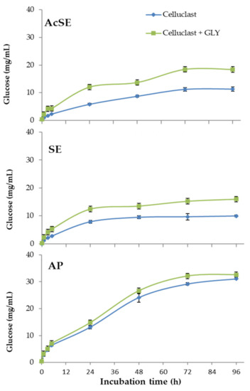 Saccharification of pretreated wheat straw (AcSE: acidic steam explosion; SE: steam explosion; AP: alkali pretreatment) with Celluclast 1.5 L (basal cocktail) and Celluclast 1.5 L supplemented with the T. amestolkiae cocktail obtained with raw glycerol as the carbon source (GLY). All assays were performed in triplicate.
