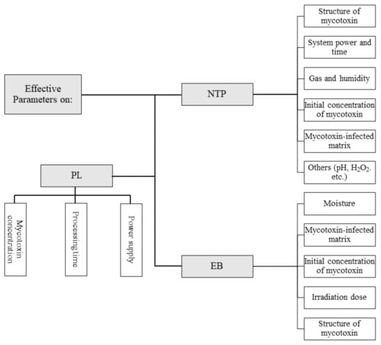 The investigation of parameters affecting the mycotoxins degradation performance of NTP, EB, and PL (Figure 1) is a critical issue discussed among published studies. Therefore, the main purposes of this study involve the introduction of these three techniques and the expression of their applications and their degradation mechanisms against mycotoxins.