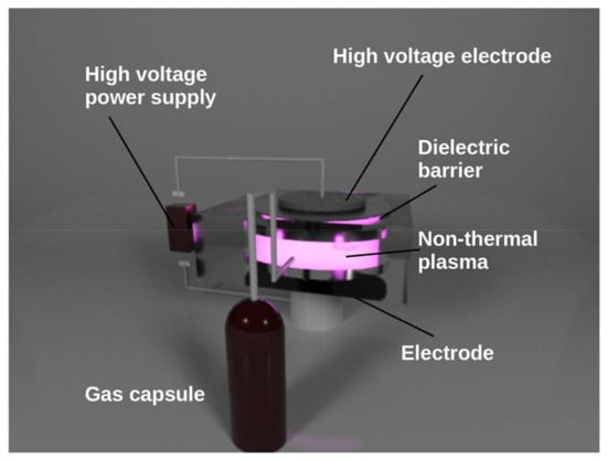 The NTP is typically obtained using an electric discharge or by applying microwaves at atmospheric or reduced pressures. The particular systems designed to produce NTP are the dielectric barrier discharge (DBD) in many modifications, corona discharge, gliding arc discharge, inductively coupled plasma, microwave discharges, or atmospheric pressure plasma jet [,,]. The DBD, as one of the most frequently used systems (Figure 2), consists typically of one or two electrodes placed in a distance of several cm or mm separated by a dielectric plate. A typical high voltage of 102 to 104 V with frequency of 100 to 104 Hz is applied to the electrode between which the plasma is produced by the electric induction. For detail overview see one of several other review papers [,,,,,]. The plasma-chemical processes as particle collisions, ionization, photoemission, photoionization, etc., lead to the production of an array of active species as excited atoms, positive ions, negative electrons, chemical radicals, UV photons, etc. Often, if the air or similar gas is used as the discharge atmosphere, a wide group of reactive oxygen species (ROS) and reactive nitrogen species (RNS) with high microbicidal effects is created. ROS include mainly single delta oxygen, ozone, atomic oxygen, peroxide, and superoxide; RNS consist mainly of nitric oxide (NO), including intermediates, NO radicals, NO+, NO−, NO2, NO2−, NO3−, ONOO−, N2O3, and N2O4 [,,,]. Compared to other conventional and non-thermal approaches (UV light, pulsed light, and gamma irradiation), NTP acts rapidly against fungi and mycotoxins; whereas, it has a rather milder impact on quality and needs a low energy input.