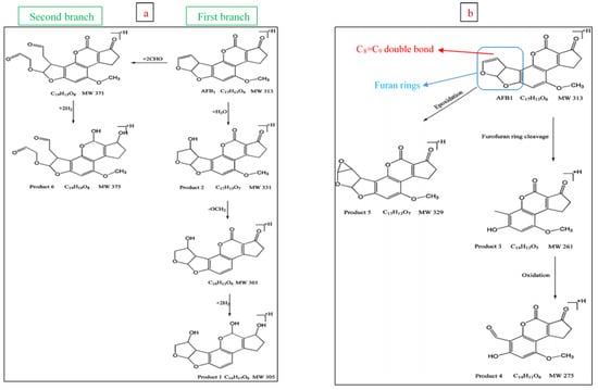 Regarding the action mechanism of these elements on aflatoxin B1, Shi and Cooper [] have suggested two pathways. These pathways and branches cause the degradation of aflatoxin B1 into six fragmented products. The first degradation pathway (Figure 3a) basically depends on the presence of H2O molecules and the neutral, the radical, and the ionized forms of H and CHO, which are produced in the NTP system. The first branch involves hydration, cleavage of methoxy group (OCH3), and hydrogenation reactions, where two main products (C17H15O7 and C16H17O6) and one intermediate compound (C16H13O6) are generated. The second branch involves the addition of aldehyde group (OCH) and H2, resulting in the generation of C19H15O8 (intermediate product) and C19H19O8 (main fragmented product).