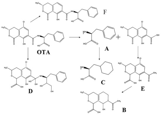 Peng and Ding [] have proposed three pathways for decomposing of ochratoxin A in an aqueous solution by EB leading to six products (A–F), see Figure 5. The first way is the substitution of chlorine on the benzene ring by H•, generating the “F” product. The second way is the oxidation of ochratoxin by OH• to produce D. The third way is the breakdown of the NH-CO bond by producing the “A” together with an intermediate structure. The “A” is hydrogenated by H• forming the product “C”. The intermediate structure is oxidized by OH• forming “E”. This “E” product is then dechlorinated and hydrogenated by H• producing “B”. The decrease of 99.34% in ochratoxin A using 10 kGy dose of EB was also reported in this study.