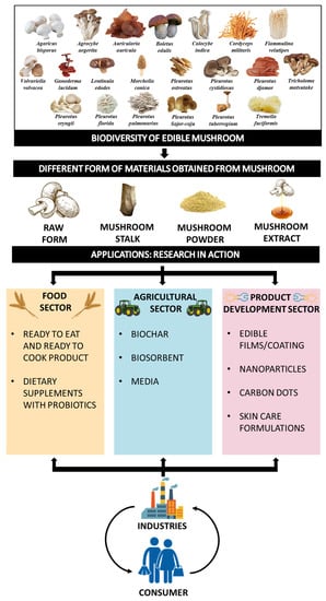 Edible mushrooms and their by-products are extensively involved in different fields with diverse applications. Due to their nutritional and functional values, mushrooms are taken as dietary supplements with probiotics and are fortified as RTE and RTC food. The bioactive molecules obtained from them are found to have applications in food products. Other than this, mushrooms are found to play an important role in the production of biochar, biosorbent, carbon dots, media, nanoparticles and skincare formulations. All the above-stated products synthesized or developed with the aid of mushrooms have shown effective results in invitro studies. However, edible films/coatings and skincare formulations developed from these edible mushrooms are still limited to the invitro level and are not yet being exploited at the commercial and industrial levels. Additionally, these edible mushrooms and their waste have immeasurable economic potential in different industries, and it can often lead to the synthesis of novel products. Still, these edible mushrooms remain an untapped resource with vast industrial applications. Thus, there is a dire need for sensible and responsible management within the production system to explore the potential of these edible mushrooms.