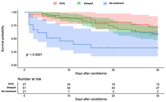 Survival analysis of patients with candidemia according to the time of start of treatment. Note: The coloured shadow shows the 95% confidence interval. Time was counted beginning the day the blood sample was taken.