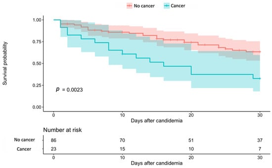 Survival analysis of patients with candidemia according to the presence of cancer. Note: The coloured shadow shows the 95% confidence interval.