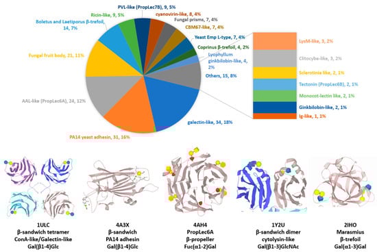 Distribution of fungal lectins 3D structures classes in UniLectin3D accessed on January 2021. Bottom: 3D view of most common folds for fungal lectins, using selected structures from the PDB (www.rcsb.org) [35]: 1ULC from Coprinopsis cinerea; 4A3X from Candida glabrata; 4AH4 from Aspergillus fumigatus; 2IHO from Marasmius oreades; 1Y2U from Agaricus bisporus..