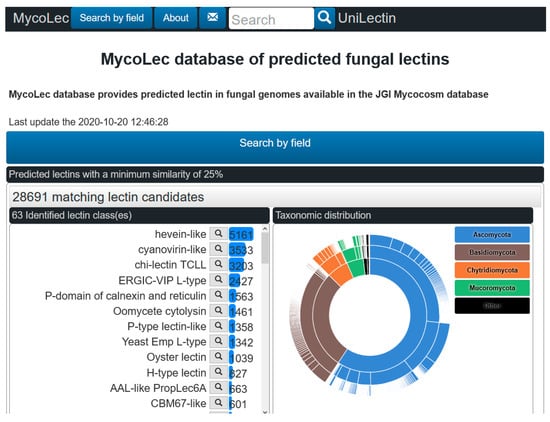 The MycoLec database (https://www.unilectin.eu/mycolec/) shares the same architecture as the LectomeXplore database and is dedicated to Fungi. The prediction from the 1419 translated fungal genomes of the Mycocosm portal (February 2020 release) resulted in approximately 28,700 sequences of putative lectins with a score greater than 0.25. The entry page of the database is displayed in Figure 2, showing the different entry points: lectins can be accessed by clicking on the different classes (left panel, with number of sequences indicated for each class), or on a taxonomy sunburst (right panel). Alternatively, the “search by field button” enables the combination of search terms such as, genus, species, classes or selected keywords. Each candidate lectin is associated with sequence information including the alignment with the reference sequence of the predicted lectin class.
