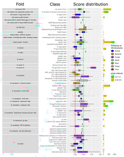 The MycoLec database contains 33,518 putative lectin sequences (28,691 with filter at 0.25 quality score). Fungal lectin prediction spreads the classification coverage from 12 to 27 folds and 20 to 63 classes (see Section 3.1 and Figure S2). The distribution of lectins by class, along with the score distribution and the structural origin is displayed in Figure 3, illustrating that many more classes are predicted in genomes than characterized in structural studies. Notably, lectins are systematically found in fungal genomes. In 43% (12,290) of cases, the predicted lectins belong to a lectin class having a fungal origin in Unilectin3D (i.e., created using fungal proteins but not restricted to it). Expectedly, the prediction score of lectins containing lectin motifs of fungal origin (Figure 3, purple) is high, with the exception of the LysM-like lectin class. Surprisingly, predicted lectins matching lectin class profiles of non-fungal origin in Unilectin3D (or in the annotation) such as, Shiga-like toxin, Oomycete cytolysin and trefoil factors tended to score high as well.