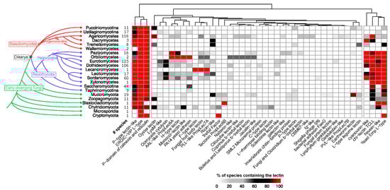 Distribution of predicted lectins by phyla and classes in MycoCosm genomes. Left, a phylogenetic tree showing the fungal divisions and classes as represented in the MycoCosm platform [32]. Right, clustering of lectin classes found in 582 species. Lectins with a similarity score >25% were used to compute the presence and abundance of the different lectin classes found in the MycoCosm genomes. The heatmap depicts lectin counts in each of the lectin classes according to the color scale displayed at the bottom of the figure.
