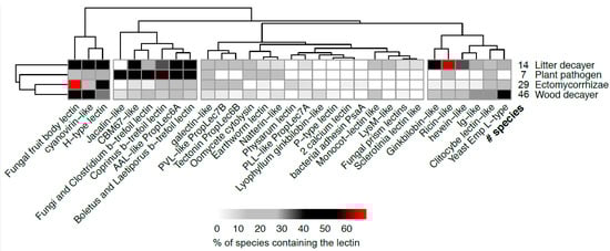Occurrence of lectin classes in Agaricomycetes species grouped by lifestyle. Identified lectins are at least 25% similar to the reference. Ubiquitous lectins were filtered out. Only ecological groups represented by more than 5 species are represented.