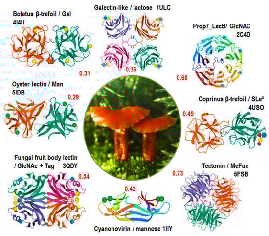 Fungi are unicellular or multicellular organisms found in terrestrial, marine and aquatic ecosystems. They adopt a wide range of ecological lifestyles (e.g., modes of nutrition) along the saprotrophism/mutualism/parasitism continuum [1,2,3]. Saprotrophic, symbiotic and pathogenic fungal species compete or cooperate with multiple bacteria, fungal, plant or animal species. Specific signaling and developmental pathways underpin the establishment and maintenance of interactions with other organisms. Self/non-self-discrimination is at the very core of the fungal hyphae development and involves surface-surface molecular interactions [4]. Similarly, the recognition of animal or plant surfaces play a key role in the pathogenic or mutualistic fungal symbioses. These interactions rely on a wide range of secreted proteins that include lectins.