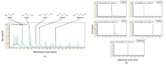 Major polysulfides produced by S. commune IFM 59347, a representative strain in which five polysulfides were detected: dimethyl disulfide (DMDS), methyl ethyl disulfide (MEDS), diethyl disulfide (DEDS), dimethyl trisulfide (DMTriS), and dimethyl tetrasulfide (DMTetraS). They are shown in the total ion chromatogram (a) and each extracted-ion chromatogram (b).