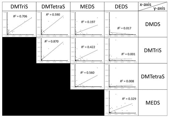 As shown in Figure 2, dimethyl polysulfide production showed high correlation coefficients, suggesting that the methyl group is derived from methanethiol as described above. However, the correlation coefficients between DEDS and dimethyl polysulfides are very low (R2 is less than 0.02, not significant). The ethyl group in DEDS and MEDS might be derived from ethanethiol [28,29] because ethanol is a major VOC of S. commune [13] and because H2S can react with ethanol to give ethanethiol in vitro [28]. The difference between the methyl group and ethyl group supplies might be attributable to the low correlation coefficients of the ion peak area between DEDS and dimethyl polysulfides.