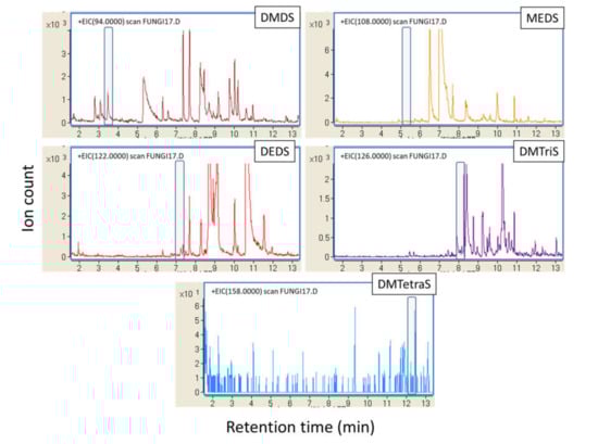 Extracted-ion chromatograms of VOCs from A. fumigatus IFM 51748. The gray-shaded area shows the putative retention time of each polysulfide.