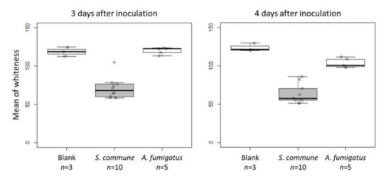 PDA was used for culturing fungi in the assay. A piece of lead acetate paper to detect H2S as little as 5 ppm in the atmosphere (Merck Millipore, Burlington, MA, USA) was taped to the back of the agar plate lid. A scrape of fungi was inoculated on the center of PDA and was cultured in a gas-barrier pouch (Mitsubishi Gas Chemical Co. Inc., Tokyo, Japan) at 35 °C for four days. The pouch contained atmosphere at the start of culturing, and while culturing was performed under the gas-barrier condition the O2 level decreased gradually. The paper was observed three and four days after inoculation. The whiteness of lead acetate paper in RGB images taken using a digital camera (TG-5; Olympus Corp., Tokyo, Japan) was determined using the mean gray value measurement function of ImageJ 1.53a [14]. The values were calculated by converting each pixel to grayscale using the formula gray = 0.299red + 0.587green + 0.114blue in ImageJ.