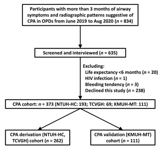 This was a multicenter prospective study conducting in three hospitals in northern (National Taiwan University Hospital Hsin-Chu branch [NTUH-HC]), middle (Taichung Veterans General Hospital [TCVGH]) and southern (Kaohsiung Medical University Hospital Kaohsiung Municipal Ta-Tung Hospital [KMUH-MT]) Taiwan between June 2019 and August 2020. We recruited participants whose CPA was suspected clinically in the respiratory outpatient department of participating hospitals. Inclusion criteria were presence of chronic airway symptoms (cough, hemoptysis, dyspnea, sputum production) for at least 3 months and radiographic findings (cavities, pleural thickening, fibrotic change, nodules, consolidation) from which CPA could not be readily excluded. Those judged to be not having CPA will be followed for at least additional 3 months for symptoms and radiographic monitoring to readily exclude CPA.