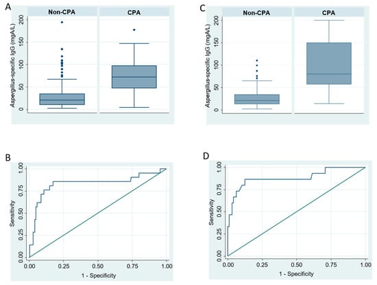 Boxplot and receiver operator characteristics (ROC) of serum Aspergillus fumigatus-specific IgG in chronic pulmonary aspergillosis (CPA) cohort ((A) boxplot in CPA derivation cohort; (B) ROC in CPA derivation cohort; (C) boxplot in CPA validation cohort; (D) ROC in CPA validation cohort).