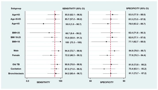 The subgroup analysis of proposed Asp-IgG cut-off level in CPA was illustrated in Figure 3. The performance of proposed cut-off level (40.5 mgA/L) was satisfactory across different subgroups. In subgroups among which CPA may be of particular concern such as old TB patients, the sensitivity and specificity were 90.9% (95% CI, 70.8–98.9%) and 81.8% (95% CI, 73.8–88.2%). In patients with pulmonary cavitation, the sensitivity and specificity were 87.5% (95% CI, 71.0–96.5%) and 75.4% (95% CI, 63.1–85.2%). In patients with bronchiectasis, the sensitivity was 84.2% (95% CI: 60.4—96.7%), and specificity was 81.1% (95% CI: 73.7—87.2%).
