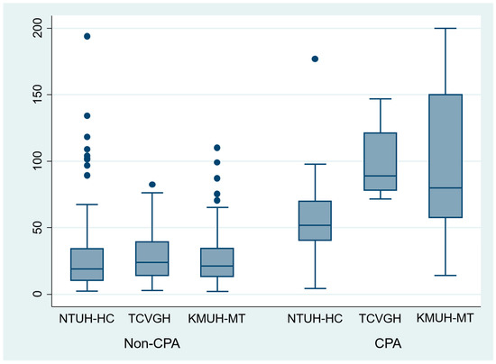 CPA and non-CPA Asp-IgG level among three different hospitals were illustrated in Figure 4. Comparison between three hospitals, the non-CPA group Asp-IgG was not different between the three hospitals (NTUH-HC vs. TCVGH vs. KMUH-MT: 26.3 ± 26.1 vs. 27.8 ± 18.1 vs. 26.2 ± 21.0 mgA/L, p = 0.889).