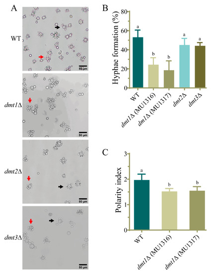 The mutants in the dmt1 gene of M. lusitanicus are affected in the hyphae emergence during yeast to mycelium transition. (A) Cells of wild-type strain MU636 (WT), dmt1Δ (MU1316 and MU1317), dmt2Δ (MU1318), and dmt3Δ (MU1320) 2.5 h after induction of hyphal development by transferring to aerobic conditions. The arrows indicate the multi-budded yeasts (red) and cells with hyphae (black). (B) The data represent the percentage of hyphae formation 2.5 h after transition induction calculated from 200 total cells. (C) Polarity index quantified from 50 yeasts with hyphae emergency after 2.5 h induction. The charts display means ± SD. Different letters above the bars indicate statistically significant differences, while the identical letters denote no significant differences calculated using one-way ANOVA (p < 0.001, Tukey test). Three independent experiments were conducted for each strain.