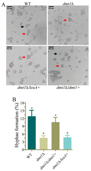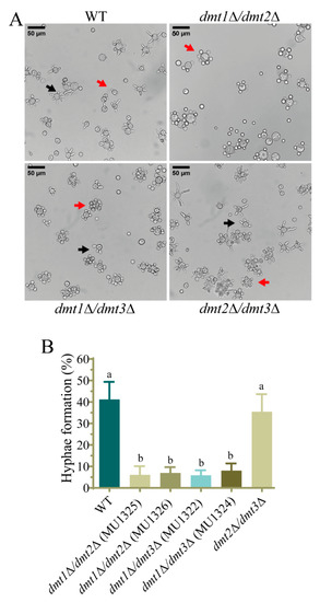 The double mutants having dmt1 deletion were affected in the hyphae emergence during yeast to mycelium transition. (A) Cells of wild-type strain CBS277.49 (WT), dmt1Δ/dmt2Δ (MU1325 and MU1326), dmt1Δ/dmt3Δ (MU1322 and MU1324), and dmt2Δ/dmt3Δ (MU1330) 2.5 h of growth after induction of hyphae formation by transferring to aerobic conditions. The arrows indicate the multi-budded yeasts (red) and cells with hyphae (black). (B) Percentage of yeasts with developed hyphae in wild type strain (CBS277.49) and the indicated double knockout mutants calculated from 200 total cells. The charts display means ± SD. Different letters above the bars indicate statistically significant differences, while the identical letters denote no statistical differences calculated using one-way ANOVA (p < 0.001, Tukey test). Three independent experiments were conducted for each strain.