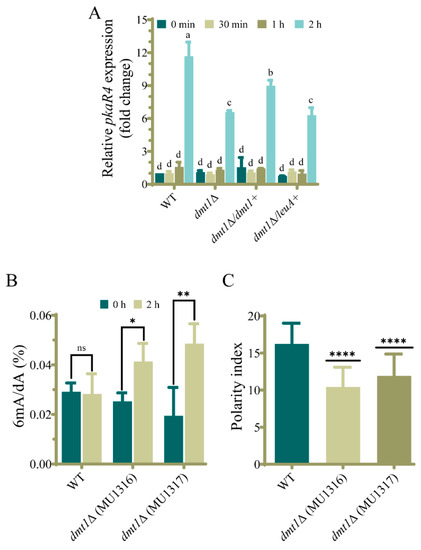3.4. The dmt1 Is Important for the Appropriated pkaR4 Transcription during the Transition from Yeast to Hyphae