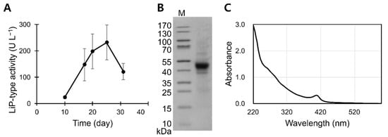 Immobilizing B. adusta cells on polyurethane foam blocks maximized the LiP activity within 10 days of culturing []. However, without immobilization, the cells exhibited no LiP activity in the same medium. Therefore, further rigorous optimizations of the growth media or culturing conditions could yield higher productivity in future studies. Nonetheless, flask cultures yielded veratryl alcohol oxidizing activity of over 230 U L−1. Upon serial filtration of the cultures, only one major protein band with an apparent molecular weight of 45 kDa was revealed by the SDS-PAGE analysis (Figure 1B). The apparent molecular weight indicates that the protein band could represent LiP, manganese peroxidase (MnP), versatile peroxidase (VP), or their combination [,,]. Strong absorption of 407 nm light confirmed that the preparation includes heme-containing peroxidase (Figure 1C).