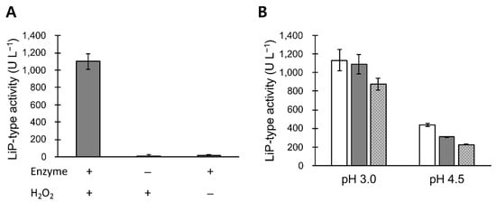 (A) Characterization of POX_Ba. Hydrogen peroxide was required for POX_Ba to oxidize veratryl alcohol (LiP-type activity), which indicated the absence of an aryl-alcohol oxidase. (B) The LiP-type activity of POX_Ba was negatively affected in a concentration-dependent manner by Mn2+, the primary substrate of MnP. White, grey, and patterned bars contained 0, 0.3, and 2 mM Mn2+, respectively. The inhibitory effect of Mn2+ was more significant at a pH of 4.5 (optimal for MnP-type activity of VP) compared to at a pH of 3.0 (reportedly optimal for the LiP-type activity of VP), which suggested competition between the LiP- and MnP-type activities of the same enzyme (likely VP). Error bars, standard deviations for triplicated reactions.
