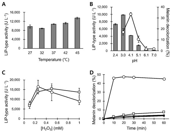 LiP is a heme-containing enzyme and can oxidatively degrade lignin, which is an extremely recalcitrant biomass. Melanin is also an electron-rich durable biopolymer that structurally resembles lignin; therefore, it can be the substrate for LiP []. P. chrysosporium LiP, either as a fermentation product of the mold [,] or as a recombinant protein expressed in Escherichia coli [], has been extensively studied. Diverse white rot fungi are known to produce various lignin degrading enzymes; therefore, testing their melanin decolorizing activities is imperative. Here, we report that the liquid culture of Bjerkandera adusta produced peroxidase capable of decolorizing melanin in the presence of veratryl alcohol and hydrogen peroxide. We also investigated some basic characteristics of the peroxidase preparation to confirm its potential for future cosmetic applications.