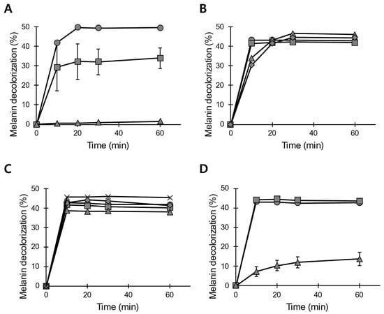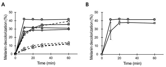 As described above, the highest LiP-type activity of POX_Ba was achieved when the reaction was buffered at a pH of 3.0 (Figure 3B). The optimal pH level to decolorize synthetic melanin was slightly higher (4.1 to 3.0, shown in Figure 3B), even though efficient melanin decolorization required veratryl alcohol as a mediator for the reaction (Figure 3D). Considering the fact that low pH levels are beneficial to the skin [], demonstrating melanin decolorization at pH levels 4–4.5 seemed reasonable. Melanin decolorization of 40–50% was observed within 10 min in the presence of 250 μM H2O2 and 2 mM veratryl alcohol at 37 °C and a pH of 4.5.