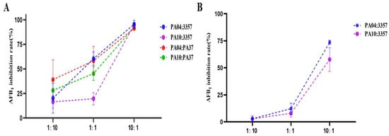 Inhibition of AFB1 biosynthesis by NRRL 3357 or PA37 with co-inoculation of different proportions of atoxigenic strains on peanuts at 30 °C for seven days (A). Inhibition of AFB1 production by NRRL 3357 with different inoculation ratios cultured on PDA at 30 °C, 10 d (B).