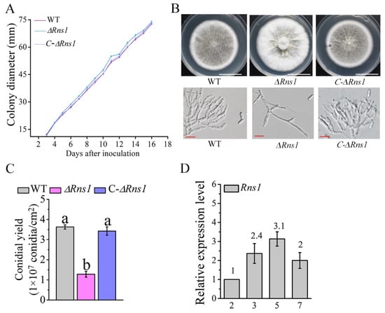 qRT-PCR analysis was conducted to assay the expression of Rns1 during the vegetative growth (at two days post inoculation (DPI) by evenly spreading 100 μL of a conidial suspension (1 × 107 conidia/mL) on a PDA plate (90 mm)), the early conidiation stage (at three DPI), the middle conidiation stage (at five DPI), and the late conidiation stage (at seven DPI). The conidiation stages were determined as previously described [,]. Compared to the vegetative stage, qRT-PCR analysis showed that the expression level of Rns1 was increased at three and five DPI and reduced at the late stage of conidiation (Figure 1D).