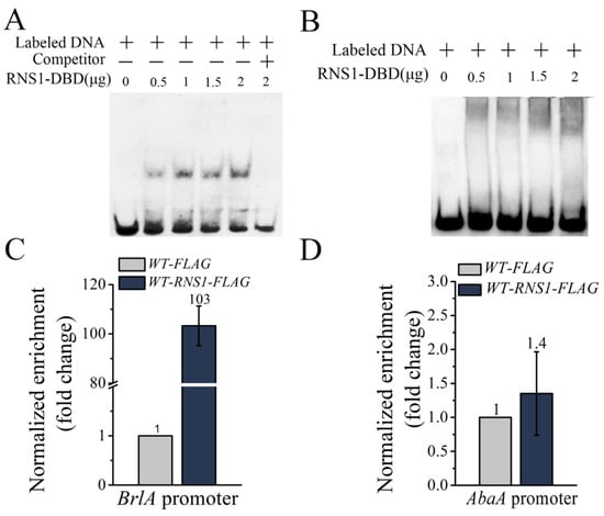 EMSA and ChIP-qPCR analysis of the binding of RNS1 to the putative the BM2 motifs in the promoters of the gene BrlA and AbaA. (A) EMSA analysis of the binding of the recombinant protein RNS1-DBD (the DNA binding domain in RNS1) to the Biotin-labeled BM2 motif in the BrlA promoter, and (B) in the AbaA promoter. The binding activity was demonstrated by the shift of the labeled DNA band prior to the addition of the specific competitor (the unlabeled DNA probe) in a 200-fold excess. (C) ChIP-qPCR analysis of the binding of the fusion proteins RNS1::FLAG to the BrlA promoter, and (D) to the AbaA promoter. WT-FLAG: a strain expressing the tag FLAG in the WT strain; WT-RNS1-FLAG: a strain expressing the fusion protein RNS1::FLAG protein in the WT.