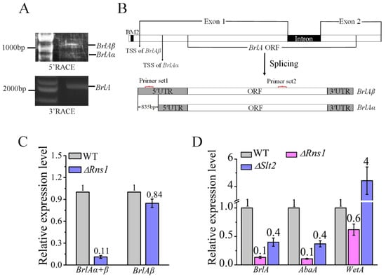 Using two sets of primers, qRT-PCR analysis was conducted to compare the expression levels of the transcripts BrlAα and BrlAβ between the WT strain and the deletion mutant ∆Rns1. With the Primer set 1 for the detection of the expression level of BrlAβ, no significant difference was found between the WT strain and the mutant ∆Rns1. However, when the Primer set 2 was used to assay both BrlAα and BrlAβ, the expression of the two transcripts in the WT strain was 9.1-fold higher than the mutant ∆Rns1. Taken together, RNS1 induced the expression of the transcript BrlAα (Figure 3C).
