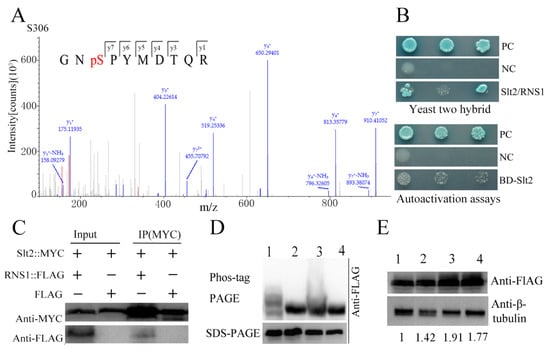 We then assayed whether the kinase Slt2 phosphorylated the RNS1 protein. An LC–MS/MS analysis showed that the serine residue at position 306 in the fusion protein RNS1::FLAG was phosphorylated in the WT-RNS1-FLAG strain (Figure 5A).
