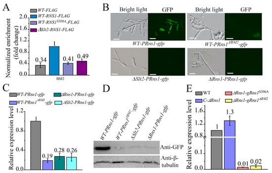 Another assay was conducted to confirm that Rns1 self-induces expression. In addition to the previously published strains WT-PRns1-gfp (the gfp gene driven by the Rns1 promoter PRns1 in the WT strain), WT-PRns1∆BM2-gfp (gfp driven by a mutated PRns1 with the BM2 motif mutated in the WT) and ∆Rns1-PRns1-gfp (gfp driven by PRns1 in the mutant ∆Rns1) [], we constructed another strain ∆Slt2-PRns1-gfp (gfp driven by PRns1 in the mutant ∆Slt2). During conidiation, the GFP signal intensity was the strongest in the strain WT- PRns1-gfp, and no obvious GFP signal was seen in the strains WT-PRns1∆BM2-gfp, ∆Rns1-PRns1-gfp and ∆Slt2-PRns1-gfp (Figure 6B). Consistent with the intensity of the GFP signal, the expression levels of GFP transcript and protein in the strain WT-PRns1-gfp were also higher than the strains WT-PRns1∆BM2-gfp, ∆Rns1-PRns1-gfp and ∆Slt2-PRns1-gfp (Figure 6C,D).