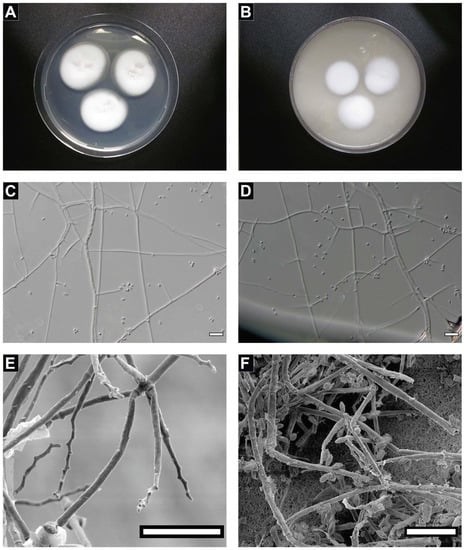 Following fresh fungal sample collection, cells were immersed in chilled 2.5% glutaraldehyde (Ted Pella Inc.; Redding, CA, USA) in 0.1 M sodium cacodylate buffer (Sigma–Aldrich, St. Louis, MO, USA) and incubated at 4 °C for 1 h before being washed 3 times in 0.1 M sodium cacodylate buffer. Cells then underwent isopropyl alcohol (IPA) dehydration via a series of incremental IPA steps from 50% to 100% (50%, 70%, 80%, 90%, 95%, and 3 times 100%) and stored at 4 °C in 100% IPA. Samples were critically point dried in an Automegasamdri 915B critical point dryer (Tousimis, Rockville, MD, USA). Samples were attached to scanning electron microscopy (SEM) stubs with carbon tape (Ted Pella Inc., Redding, CA, USA), followed by carbon coating with a Leica EM ACE600 Carbon Evaporator (Leica, Wetzlar, Germany) to a thickness of ~12 nm. SEM analysis was performed with an FEI Quanta 200F scanning electron microscope (Thermo Fisher, Waltham, MA, USA).