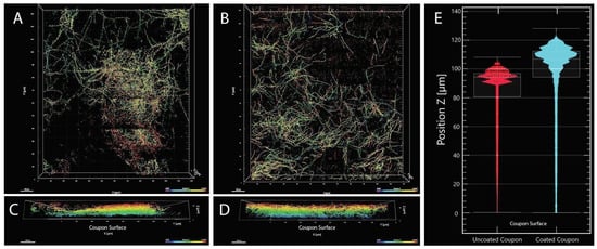 The SEM of vegetative cells of the FJII-L10-SW-P1 strain revealed thin membranous white layers surrounding the conidia and were presumed to be composed of molecules such as extracellular polymeric substances (EPS), which enabled biofilm formation (Figure 1E and Figure S4). When the biofilm formation was characterized on three different materials as substrate, the FJII-L10-SW-P1 strain was able to form biofilms on the Teflon (tetrafluoroethylene) coupons as well as on the plastic (polypropylene) walls of the conical Falcon tubes and the plastic (polystyrene) of the sides of the glass (borosilicate) bottomed Petri dish. Confocal imaging of the Teflon coupons (Figure 2) indicated that there was biomass present on both the uncoated and the antimicrobial-coated coupons. The uncoated coupon had patches of high-density biofilm and regions of no fungal mycelium, while the antimicrobial coated coupon had a much more distributed density of mycelium across the area that was imaged. Both antimicrobials coated and uncoated coupons showed lower amounts of biofilm at the substrate surface of the coupon (purple and blue colors, Figure 2) and more biofilm near the top of the biofilm (orange and red colors). Quantification of surface-filling voxels indicated that the biofilm formed on the uncoated Teflon is smaller (1767 µm3) and the median height is closer to the surface (94 µm) while the biofilm formed the coated Teflon coupon is larger (3326 µm3) and has a higher median height (107 µm). The shape of both biofilms resembles canopy morphology. Biofilms were not formed on either the glass-bottomed Petri dishes or on the Inconel coupons. Both borosilicate glass surfaces and Inconel (a nickel-chrome superalloy) are smooth surfaces, while Inconel is additionally resistant to corrosion and oxidation.