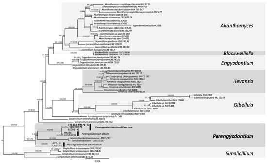 The taxonomy of Parengyodontium is complex, as its members were originally assigned to the genus Beauveria [], then to Tritirachium [], and as Engyodotium []. Finally, phylogenetic analyses targeting the ITS region, 28S nuclear ribosomal DNA, and β-tubulin gene as well as matrix-assisted laser desorption ionization–time of flight mass spectrometry (MALDI-TOF-MS) profiles, resulted in transferring members of the Engyodotium species to a novel genus, Parengyodontium, within the family Cordycipitaceae []. At the time of writing, the genus Parengyodontium consists of P. album [] and P. americanum []. The ITS-based phylogenetic analysis and MALDI-TOF profiles of several P. album strains displayed three distinct subclades, whereas the 28S rDNA-based phylogeny could not separate subclades 1 and 2 []. The cryptic species associated with subclades 1 and 2 need more study, but during this study, the WGS-based phylogeny and multi-locus sequence type (MLST) analyses revealed that strains belonging to subclade 3 should be classified as a novel species of the genus Parengyodontium.