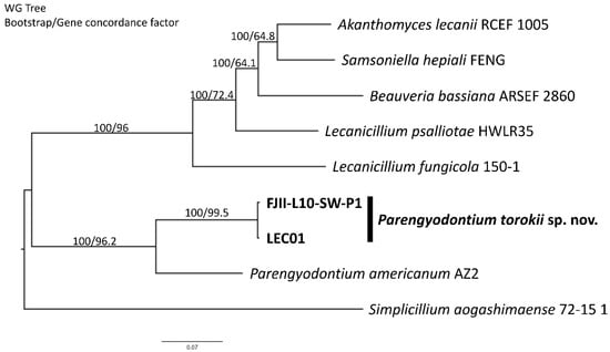 A phylogenomic approach based on 5334 single-copy orthologs screened in nine available whole genomes was carried out in order to confirm the phylogenetic placement of the P. torokii. By rooting the tree with Simplicillium aogashimaense, genomes of P. torokii FJII-L10-SW-P1 and LEC01 strains are clustered in a monophyletic branch, next to species P. americanum species. The Parengyodontium group is highly supported by bootstrap and gene concordance factors (100/96.2—Figure 4). Unfortunately, no genomes of P. album are available; this is sorely needed to precisely define the phylogenomic relationships, along with other Cordycipitaceae fungi, such as L. kalimantanense and T. wallacei.